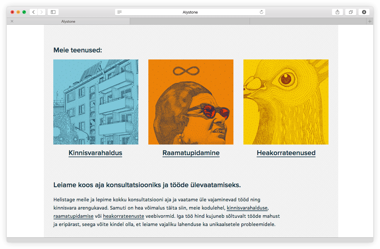 Alystone on kinnisvarahaldusega tegelev ettevõte, mille vana logo ja koduleht vajasid uuenduskuuri. Soov oli eristuda ja pakkuda klientidele kaasaegset lahedust, mis võimaldab kodulehte külastada nii lauaarvuti kui ka nutiseadmetega. Kasutatud illustratsioonid pakuvad sageli tõsisele tegevusvaldkonnale mängulisust ja silmarõõmu.